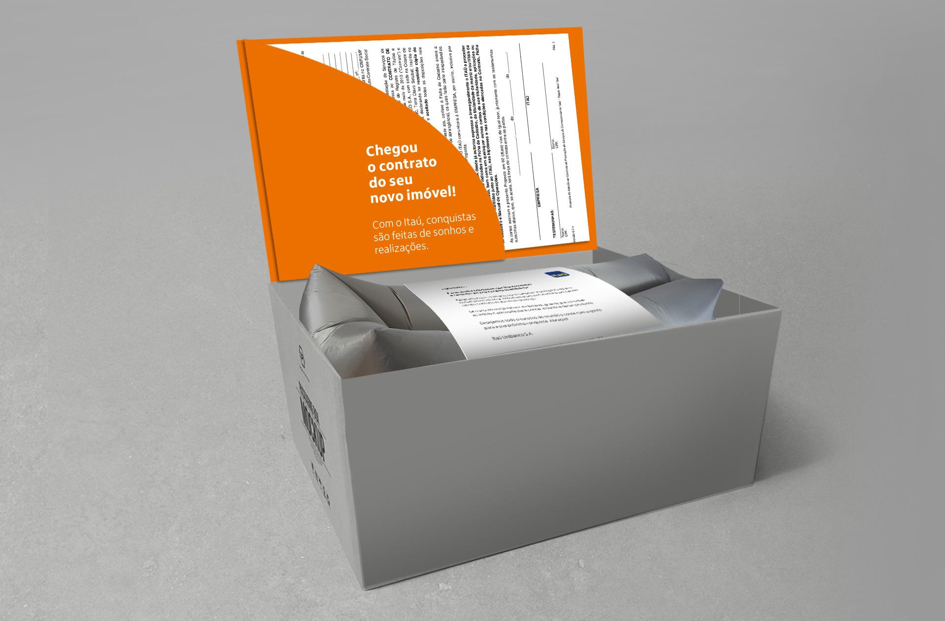 Ao abrir a caixa, o cliente se depara com o contrato do imóvel, presentes e uma mensagem.