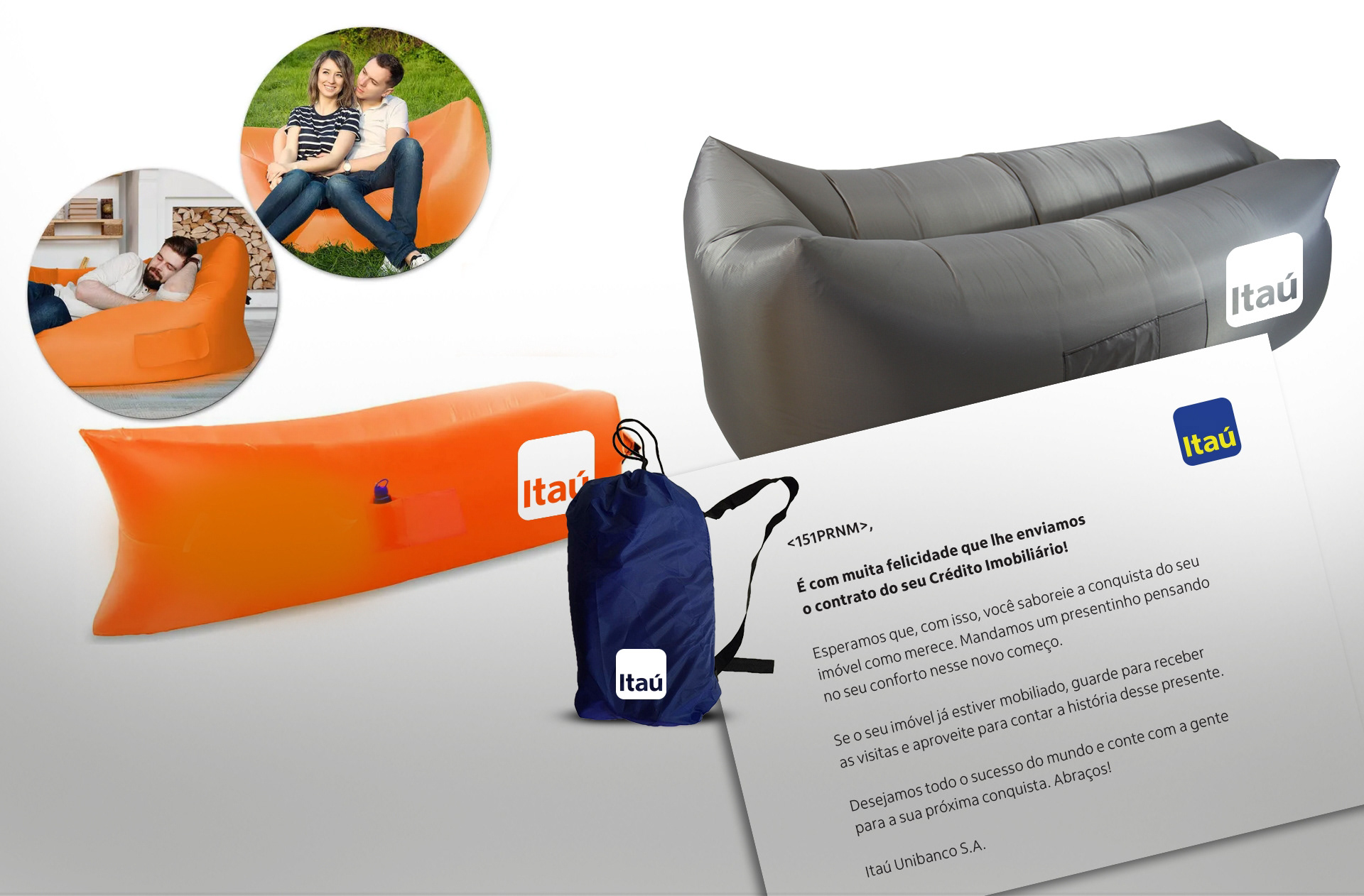 Para a pessoa ter conforto antes mesmo de mobiliar o imóvel, demos de presente um sofá inflável. Assim, o cliente teria inclusive como acomodar mais pessoas quando precisasse. Além de uma história para contar às visitas sobre o presente que ganhou ao comprar o imóvel pelo Itaú.
