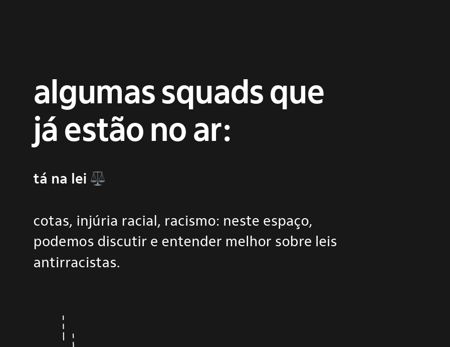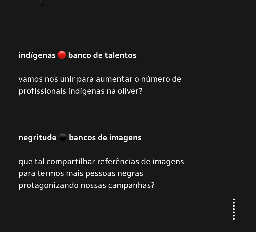 Propus então organizarmos comunidades. Nelas, as minorias compartilhariam suas experiências, e a Oliver poderia entender suas reais necessidades. Inspirado no pioneirismo da Oliver no modelo In-House, sugeri um nome para ela também mergulhar na realidade de seus colaboradores.